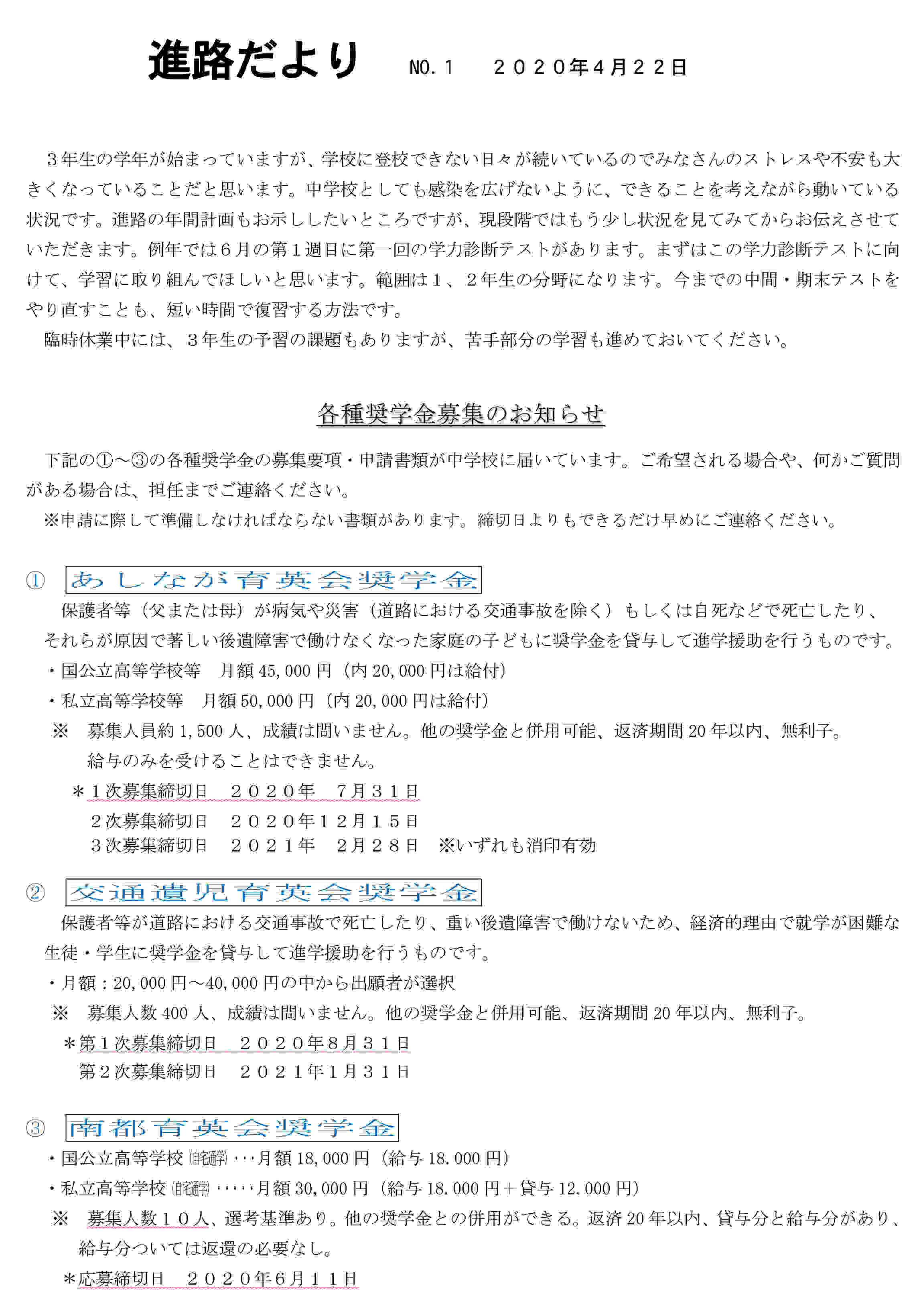 進路通信1号-1 2020年